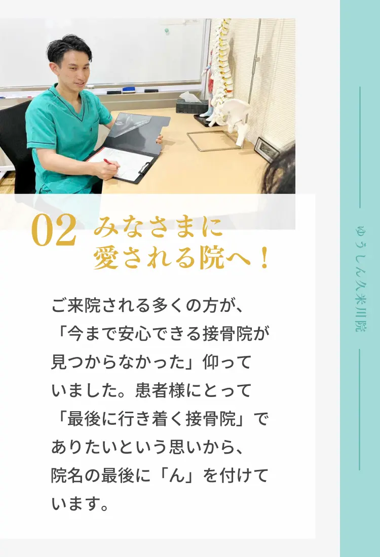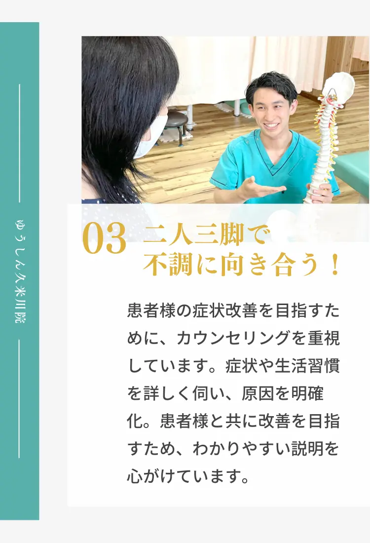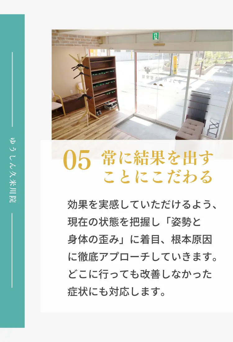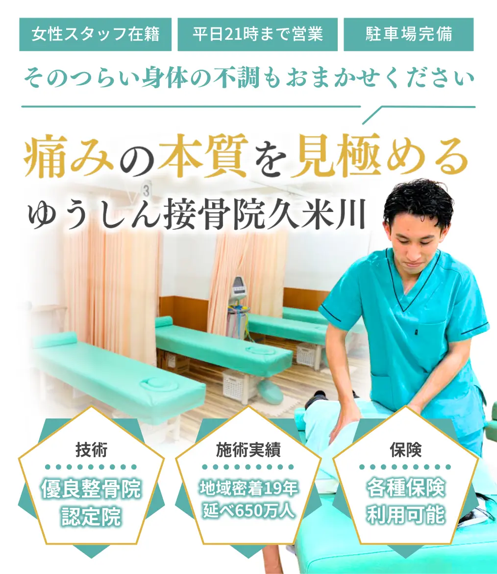 院名 ゆうしん鍼灸整骨院 所在地 〒189-0013 東京都東村山市栄町2-5-10 クレール久米川 電話番号 042-332-7788 営業時間 月〜金 9:00~12:00 / 15:00~21:00 土日祝 9:00~18:00 駐車場 あり Googleマップ